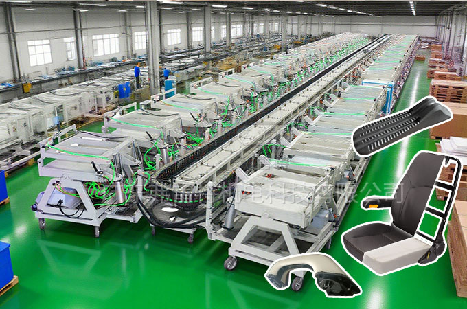 3. 懸掛線生產線:處理大型工件的利器 懸掛線將模具或工件懸掛在架空軌道上,在多個工位間移動。其最大優勢是能處理大型、重型或形狀特殊的制品,如汽車保險杠、大型冷藏箱體、雕塑家具等。地面空間得到釋放,物流更加順暢。配合我們的高壓發泡機和六軸機械手,可以實現復雜三維路徑的精準澆注,自動化程度極高。