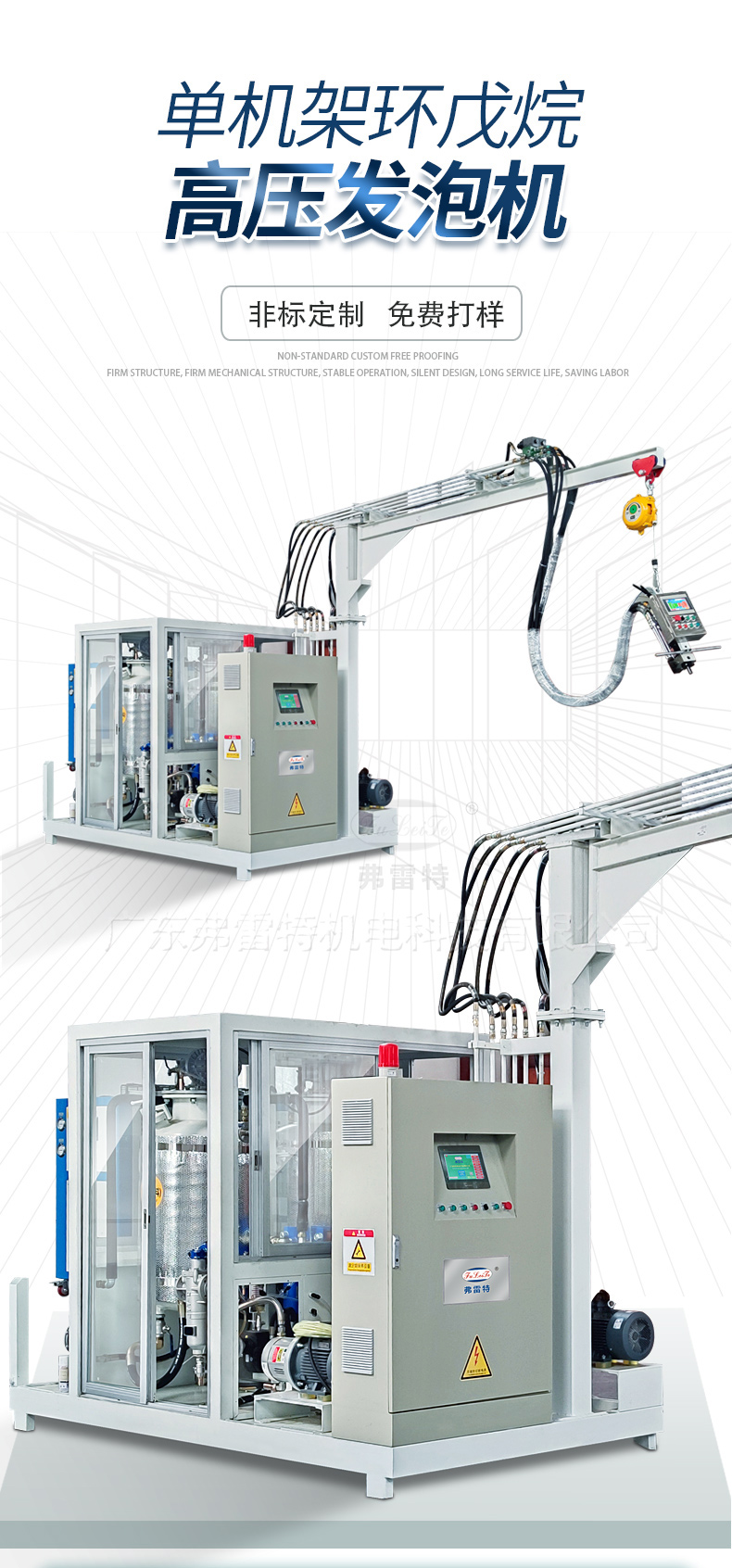本系統采用自清潔/止逆防濺粘/新型V型發泡槍(實現3次混合功能),結構美觀、操作方便,根據客戶實際情況,還可以一機雙槍使用雙槍自動切換,變頻節能、應用自如,專為客戶量身訂做發泡完善系統