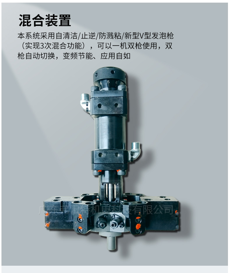 4、混合裝置:采用自清潔/止逆/防濺粘/新型V型(實現(xiàn)3次混合功能)發(fā)泡槍,結(jié)構(gòu)美觀,操作方便。配合西門子聚氨酯專用泵,注射準確,混合效果好。