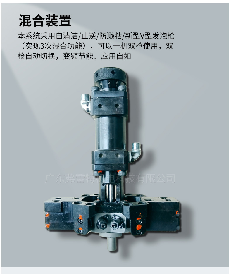 混合裝置:本系統(tǒng)采用自清潔/止逆/防濺粘/新型V型(實現(xiàn)3次混合功能)發(fā)泡槍,結(jié)構(gòu)美觀、操作方便。配合西門子聚氨酯專用泵,注射準(zhǔn),混合效果很好。