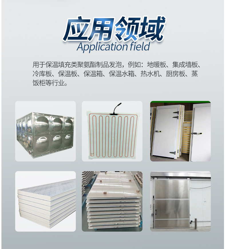 用于保溫填充類聚氨酯制品發(fā)泡,例如:地暖板、集成墻板、冷庫板、保溫板、保溫箱、保溫水箱、熱水器、廚房板、蒸飯柜等行業(yè)。