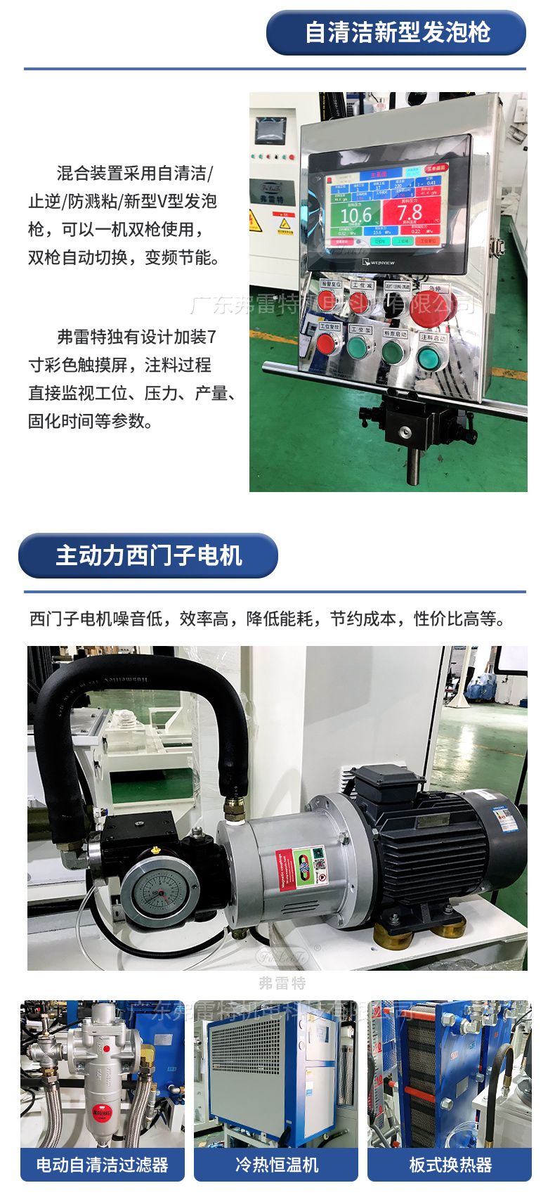 1、操作方便,生產效率提高50%: 提供人機界面,顯示各種壓力、溫度、設定注入時間、故障提示等一系列設定參數,人機合一,方便可靠,提高生產效率;