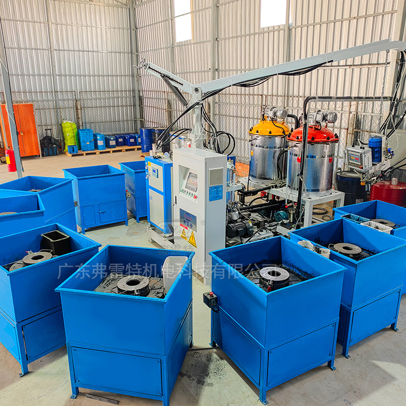 弗雷特PU輪全套聚氨酯低壓發(fā)泡生產(chǎn)線設(shè)備出口柬埔寨,全套發(fā)泡生產(chǎn)線設(shè)備已經(jīng)送到客戶工廠并安裝調(diào)試完成。整條生產(chǎn)線由10套離心機(jī)和1臺弗雷特低壓發(fā)泡機(jī)組成,澆注后使用離心機(jī)可以使原料分布均勻,發(fā)泡成型效果更好,整個操作步驟非常簡單。弗雷特的發(fā)泡機(jī)設(shè)備已出口到全球100多個國家,業(yè)務(wù)遍及歐洲、南美洲、東南亞、中東和非洲等地區(qū)。聚氨酯低壓發(fā)泡機(jī)參數(shù):