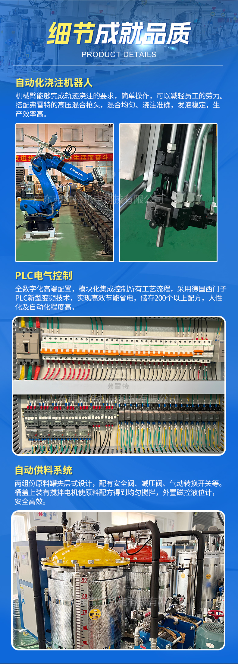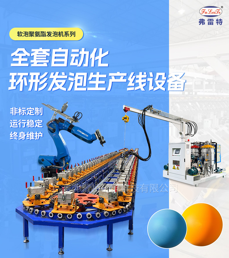 這是一套集成了軟泡聚氨酯高壓發泡機、六軸聯動灌注機器人和73米長140個工位的自動化環形發泡生產線發泡設備。140個模具工位晝夜流轉,核心發泡環節實現全程自動化,人機協同使日均產能突破3000件,同時將產品合格率穩定在99.2%以上。弗雷特環形產線用科技賦能人力,用經驗優化算法。廣東弗雷特是一家國家級高新技術企業,科技中小型企業,創新型企業和專精特新企業。軟泡聚氨酯高壓發泡機參數: