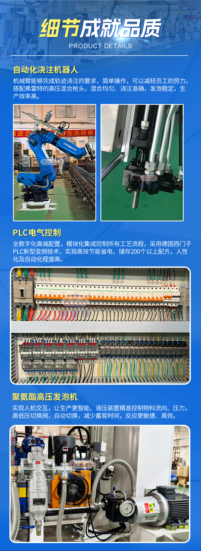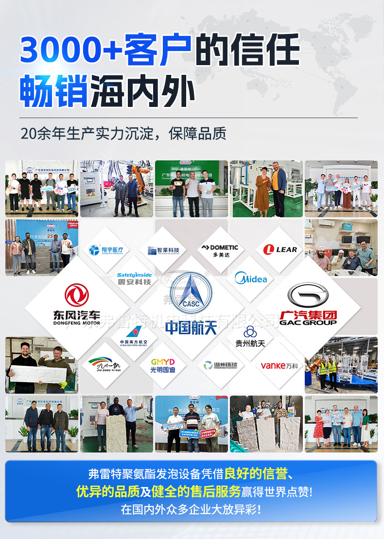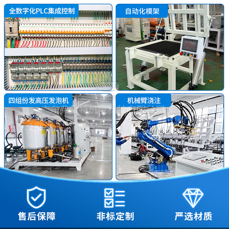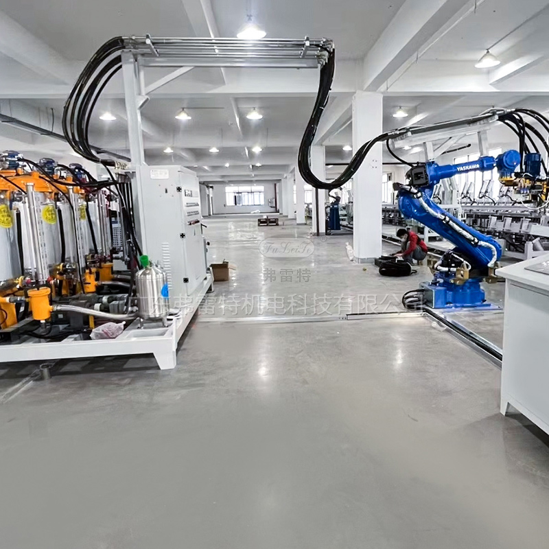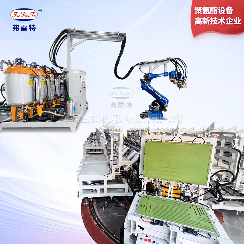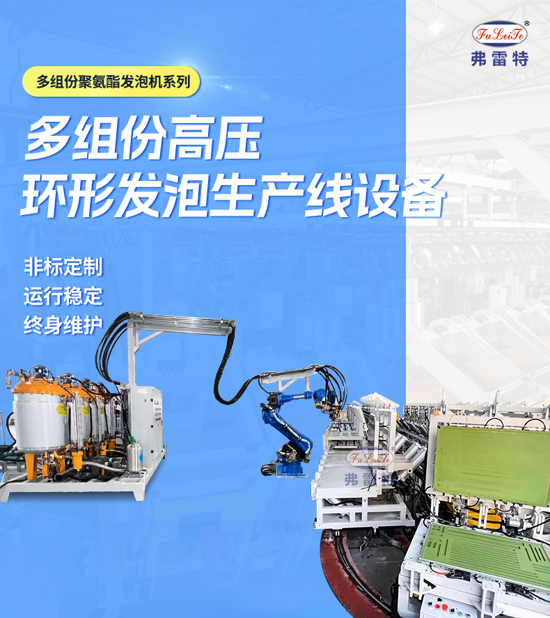這套設備采用弗雷特研發的機械臂自動化澆注,操作更為簡單,性價比高;自動機械臂搭配弗雷特聚氨酯高壓發泡機,高壓槍頭自動澆注,氣動模架自動開合,節省人力,操作更為方便。整套發泡生產線由弗雷特制造,我們致力于為客戶提供完整的聚氨酯設備配套方案。多組份聚氨酯高壓發泡機參數