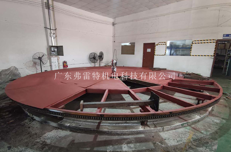 功能:通過7.6米的大型轉盤對12套模架進行固定,360°自動旋轉配合脫模機機器人、注料機器人、聚氨酯發泡機等設備工作,以達到運動狀態下進行產品的自動化生產,提高產能。