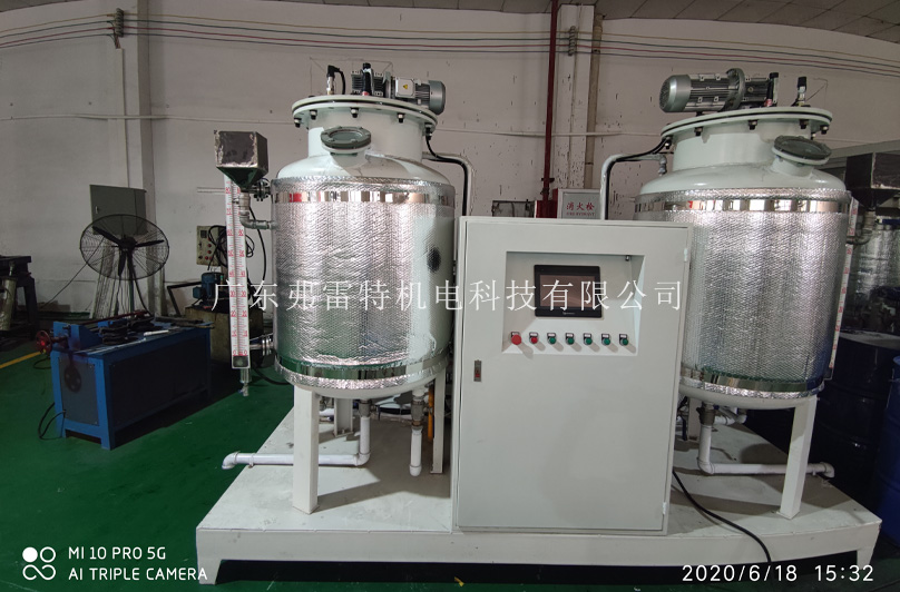 功能:預先把發泡料抽入設備內通過恒溫機對發泡料進行冷卻降溫、溫度保持以達到發泡料所需的溫度,通過攪拌機對料均勻攪拌,供料泵對發泡機自動供料等,以達到發泡機不停機工作,大大提升發泡機人工手動加料、降溫、攪拌等所需時間。