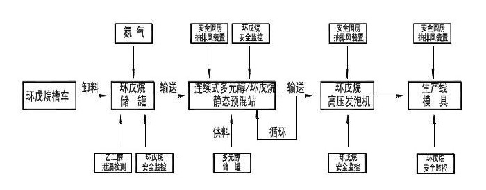 環戊烷與多元醇是通過靜態混合器混合的。混合設備通常是無人操作,自動地配置環戊烷多元醇混合物。多元醇/環戊烷靜態預混是一種連續式預混裝置,通過兩臺計量泵分別計量多元醇和環戊烷,混合比例采用流量計進行監測,并設置誤差報警信號。在預混站內,除配置多元醇工作料罐外,通常還配置一個多元醇/環戊烷混合物中間料罐,在預混站內還設置有圍房、環戊烷探頭及抽排風裝置。